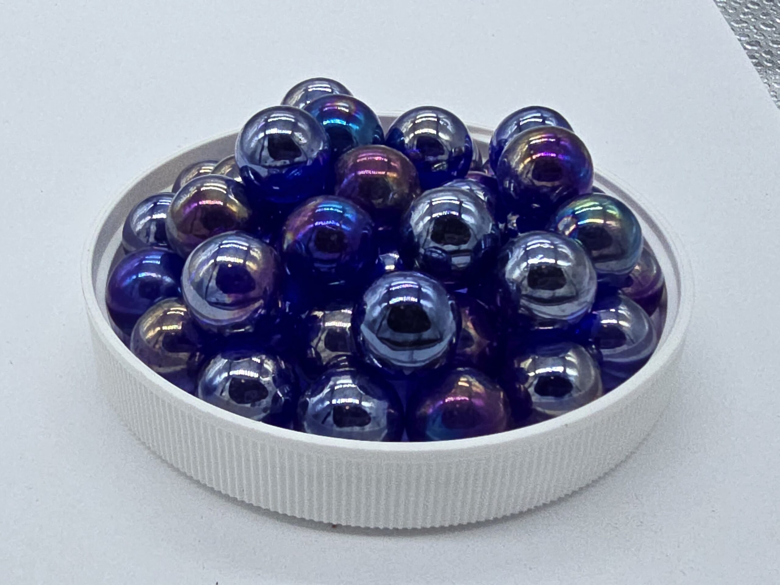 These stunningly, lovely, 14mm “Lustered Cobalt” blue marbles come in packs of 25. Made of iridescent, lustered blue, translucent glass, the color changes slightly in different light. The pictures do not do justice to these marbles. They glitter and shine like little gems. These .55 inch collectible marbles will surely create a conversation whenever used or placed on display!