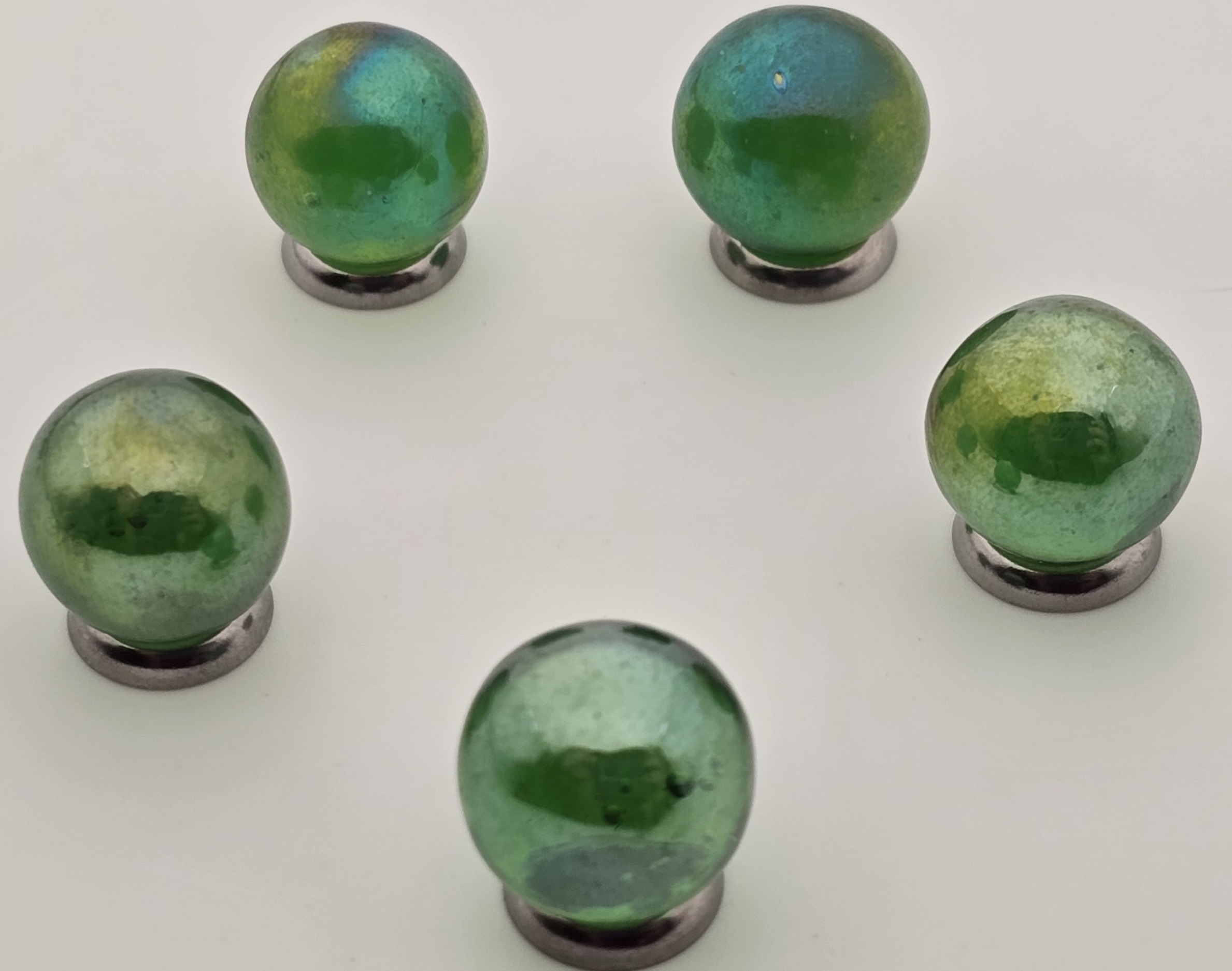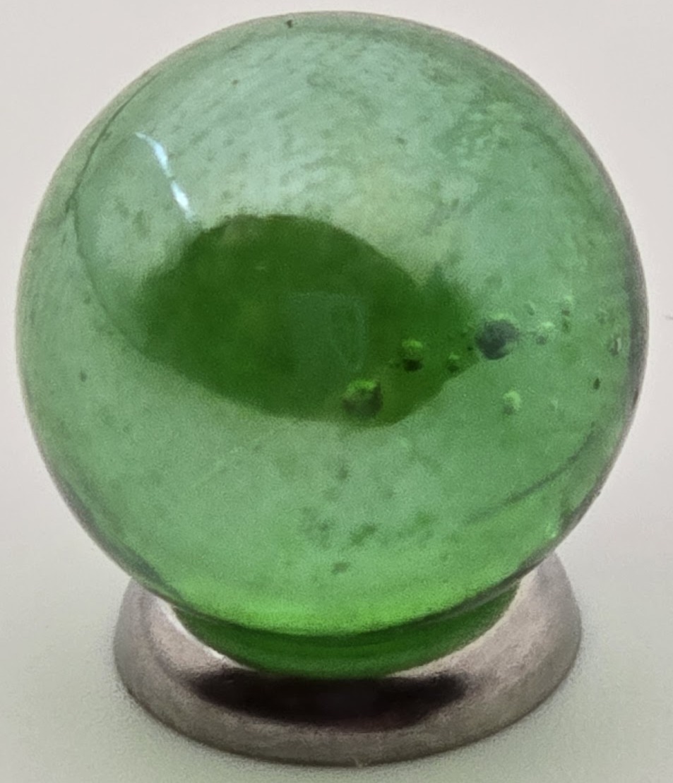 Tucked away for nearly two decades, these Lustered Green marbles were made in 2005 or earlier and were recently found at a warehouse auction.