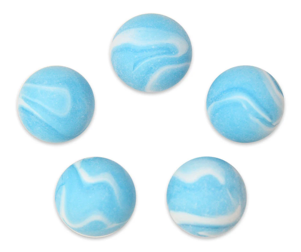 Frostberry (Beluga Whale) Mega Marble Shooters come in packs of 5. They each measure approximately 25mm (1″) in diameter. Marbles are made of opaque light blue glass with white swirls and a matte frosted finish. Made in Mexico between the years of 2011 and 2015 by Vacor for Mega Marbles, they are now retired and becoming difficult to find. These rare, beautiful marbles make an excellent addition to any collection when put on display or used in marble games or marble runs. Great for use in Decorating, Art Work, Games, Crafts, Jewelry, Yard Art or Collecting.