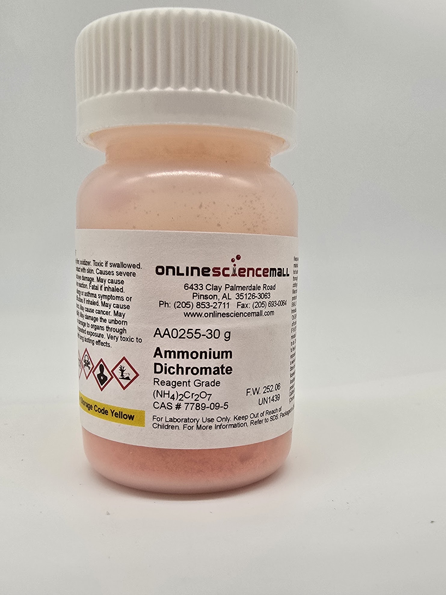 2 pack 30g of ammonium dichromate ((NH₄)₂Cr₂O₇), a bright orange crystalline compound primarily used in laboratory demonstrations, pyrotechnics, and as an oxidizing agent in chemical experiments. Known for producing the dramatic ‘volcano’ decomposition reaction when ignited. Highly toxic and a strong oxidizer—handle only with proper safety equipment and in controlled environments.