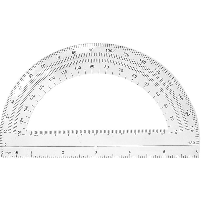 These 180 degree clear plastic protractors have both a 6 inch ruler edge and a 10 cm ruler on the open center. A Pencil hole is located at the 3 inch ruler mark. The black markings clearly define the 1 degree increments making it easy to read. Plotting 0 to 180 degrees can be done left to right and right to left. Great for art or geometry class and home crafts. Classroom pack of 30.
